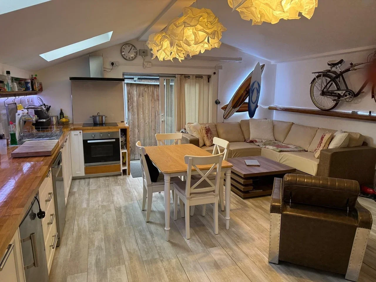The property features a bright and spacious open-plan living and dining area with skylights that fill the space with natural light, creating a warm and inviting atmosphere perfect for both relaxing and entertaining. The modern kitchen is well fitted with generous worktop space, integrated appliances and contemporary cabinetry.